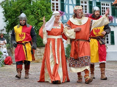 Mittelalterliches Markttreiben mit Musikdarbietung und Zauberei,Darstellern von Alltagsszenen und Schwertkämpfen,altertümlicher Spielestraße,Riesenseifenblasen und einem Erzähltheater für Kinder.