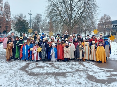 Foto (Bildquelle: Stadt Eislingen): Nach dem traditionellen Spaghetti-Essen,spendiert von Oberbürgermeister Klaus Heininger,machte sich die große Gruppe Sternsinger wieder auf den Weg,um den Segen in die Häuser Eislingens zu bringen.