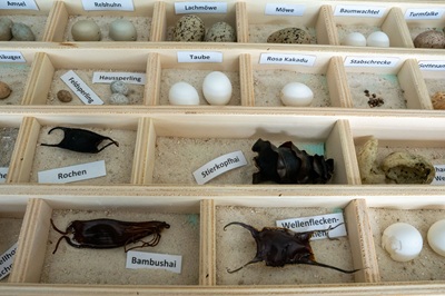 Foto (© Wilhelma Stuttgart/Lisa-Marie Grimmer): Eine Eiersammlung präsentiert eine Vielfalt von Eiern sowohl von Vögeln als auch von Fischen,Insekten und anderen Tieren.