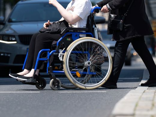 Frau schiebt Person im Rollstuhl über die Straße